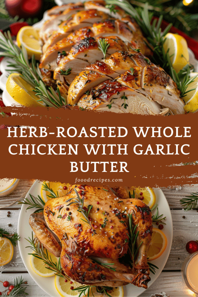 Whether you’re hosting your first Christmas dinner or looking for something cozier than a massive turkey, this herb-roasted whole chicken with garlic butter is a holiday main dish that delivers comfort, flavor, and elegance. It’s the kind of recipe that brings people together with its irresistible aroma, juicy meat, and perfectly crisped skin.